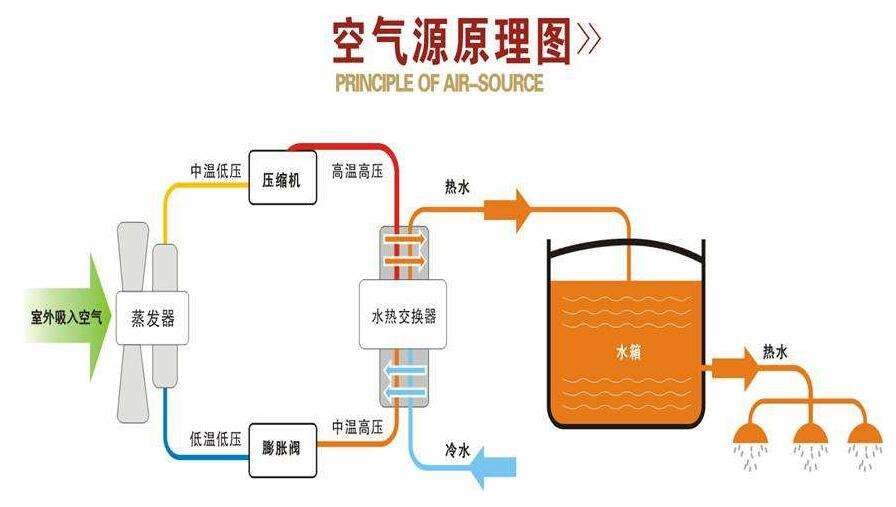大致的過程是:壓縮機(jī)將冷媒壓縮,在此過程中冷媒溫度升高,通過冷凝器時(shí)釋放熱量制造熱水,熱交換后的冷媒回到壓縮機(jī)進(jìn)行下一循環(huán)。